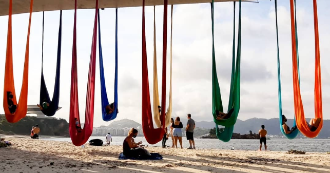 Val Martins aprendeu tecido acrobático longe do mar. Foi em Brasília onde começou a sair do chão e ganhar os ares. De tanto voar, foi parar em Niterói e viu na ponte da praia da Boa Viagem um novo lugar para os seus treinos. Aos poucos, quem passava se interessava pelo exercício tão bonito e incomum e foi assim que Val começou a compartilhar seus conhecimentos. Hoje, o Fantástico Mundo não é só dela, mas também de facilitadores, praticantes e até dos pedestres curiosos, que formam plateia e aplaudem de pé